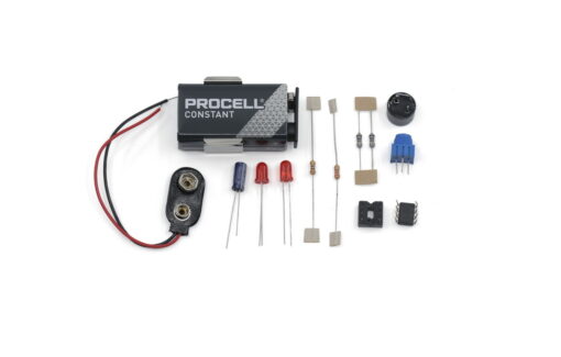 Kit Includes: Artistic Circuit Board, Hak4Kidz Branded Lanyard, 555 timer (1), 8-pin socket (1), Red LEDs (2), Resistors (4), Potentiometer (1), Capacitor (1), Piezo Buzzer (1), 9V Battery Clip (1) and Holder (1), and a Battery.