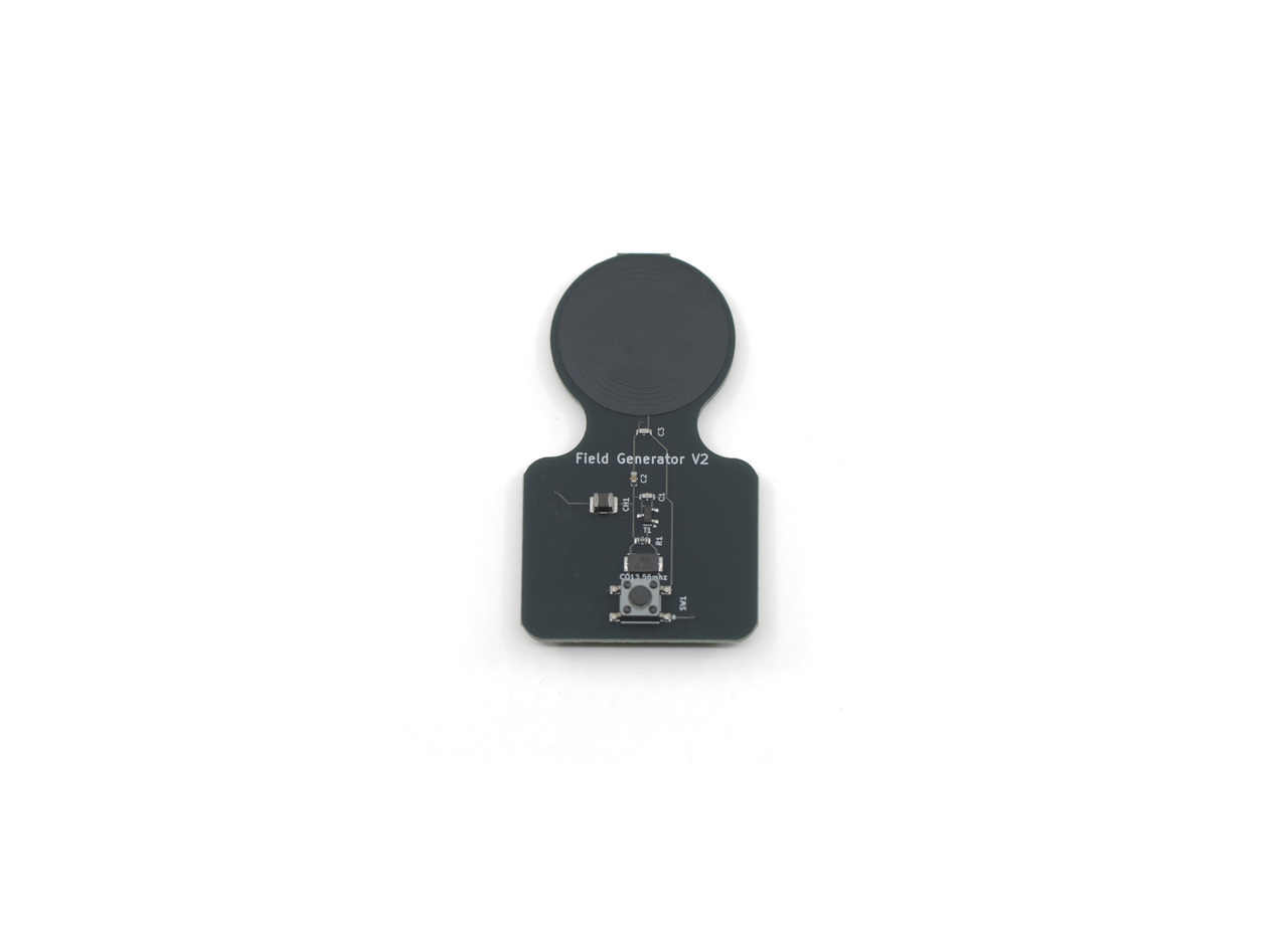This 13.56mhz field generator will create a 13.56mhz signal powered by a small button cell 3v 2032 battery.
